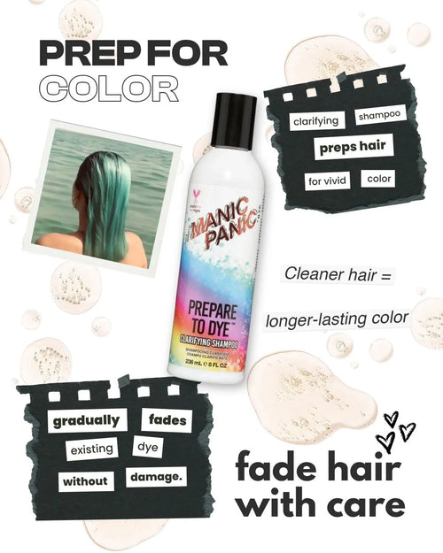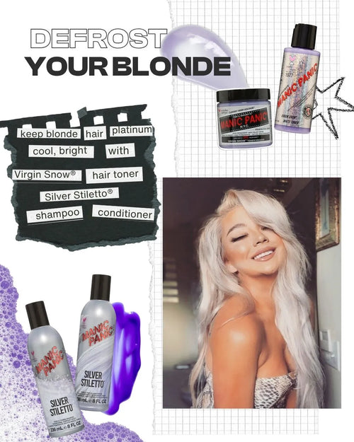Clarify, tone, and prep your hair for pastels, neons, and brights with Manic Panic® Clarifying Shampoo, Virgin Snow®, or Silver Stiletto®.
